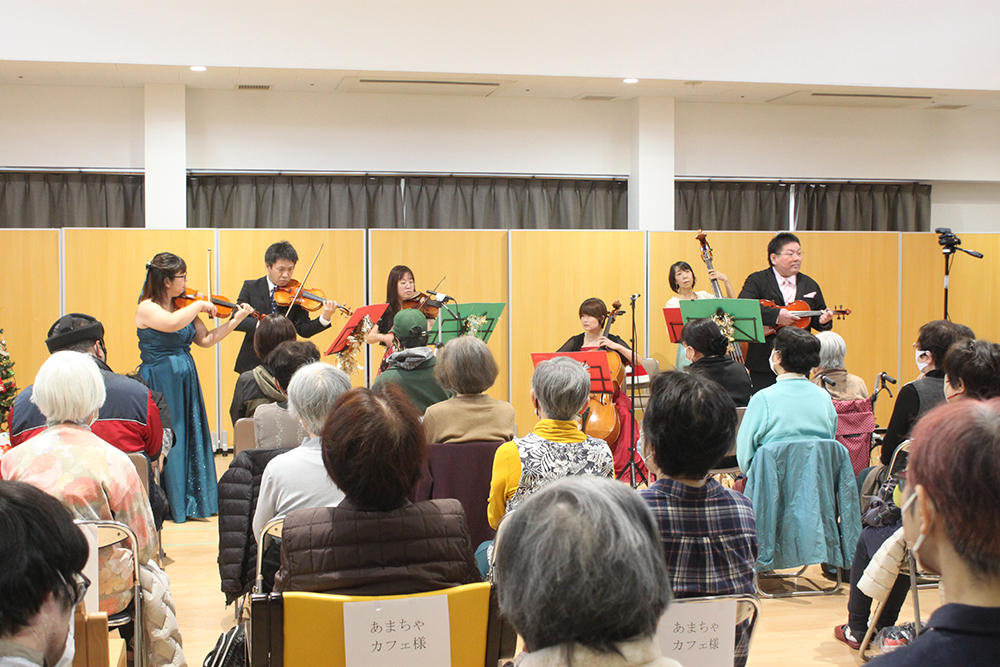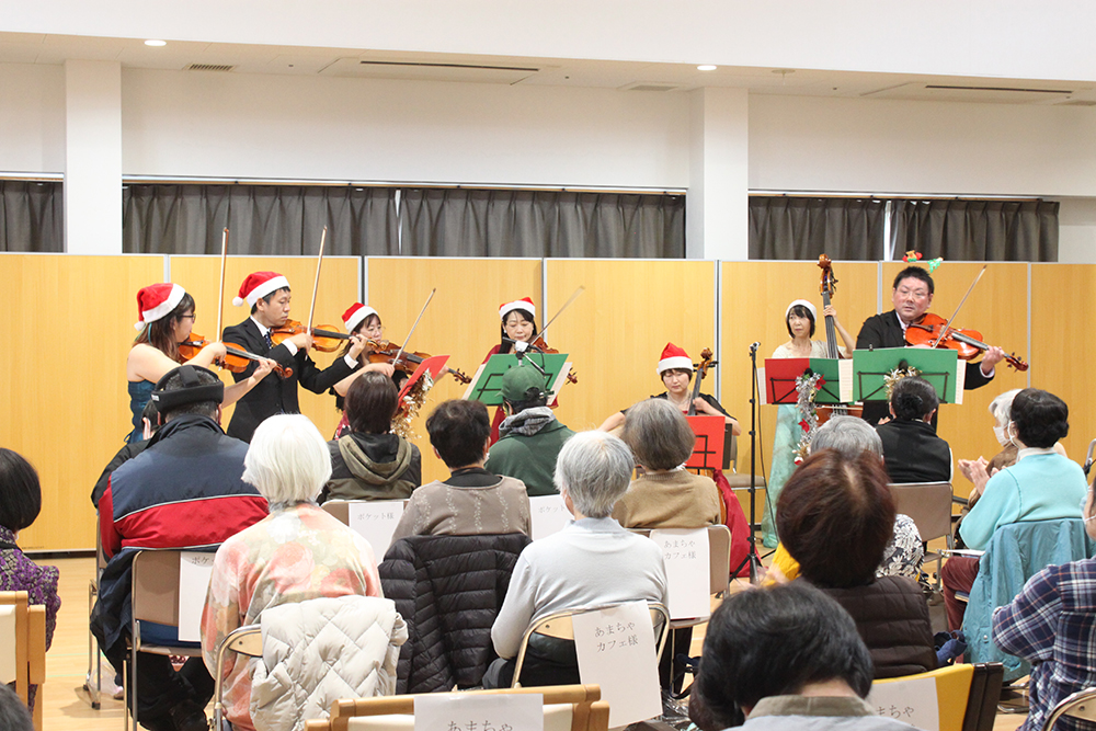 ヴァイオリン4名、ヴィオラ1名、チェロ1名、コントラバス1名という豪華編成で、クリスマスの定番曲に加え、「北国の春」「ここに幸あり」「ふるさと」など懐かしく心に染みる曲を演奏